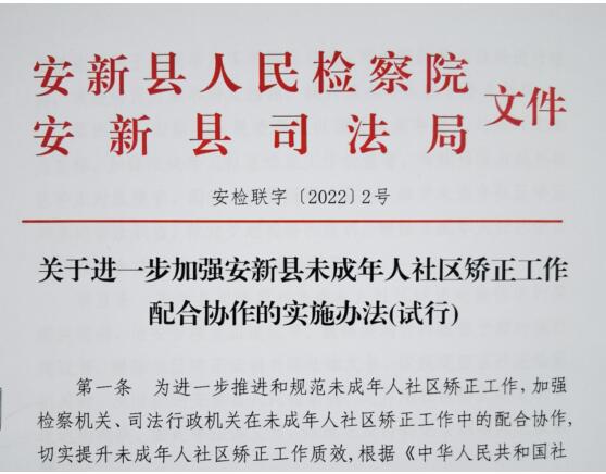 在高墻之外,未檢檢察官發(fā)現(xiàn)當(dāng)?shù)厣鐓^(qū)矯正機構(gòu)對未成年社區(qū)矯正對象未制定個性化矯正方案和針對性的矯正措施,且未按規(guī)定轉(zhuǎn)送法律文書、抄送調(diào)查評估報告和解除社區(qū)矯正證明書問題較為普遍。為此,安新縣檢察院向安新縣司法局發(fā)出檢察建議,與縣司法局專門召開進一步規(guī)范未成年人社區(qū)矯正工作會,推動相關(guān)問題得到及時整改,并于2022年3月與縣司法局會簽了《關(guān)于進一步加強安新縣未成年人社區(qū)矯正工作配合協(xié)作的實施辦法》,建立長效監(jiān)督、配合與協(xié)作工作機制。