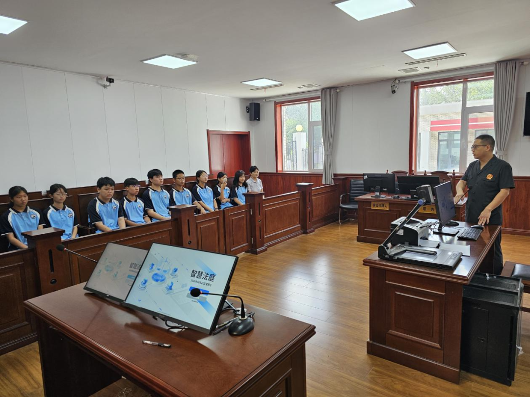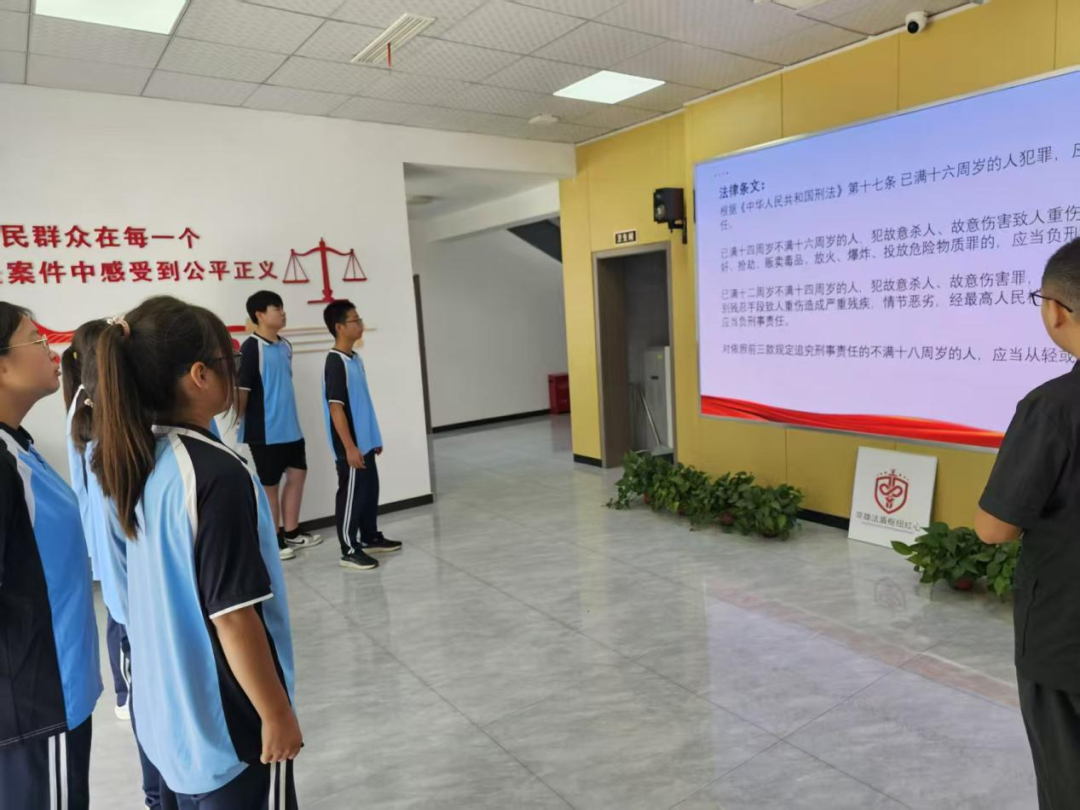 老師和學(xué)生們參觀了安檢室、信訪接待室、調(diào)解室、訴訟服務(wù)中心,負(fù)責(zé)人郭智輝介紹法庭黨建和審判融合工作開展情況,如何以“黨建紅”引領(lǐng)“法治藍(lán)”,以司法裁判為“盾”筑牢法律底線,老師和學(xué)生們對黨建和審判融合工作有了深入的了解。