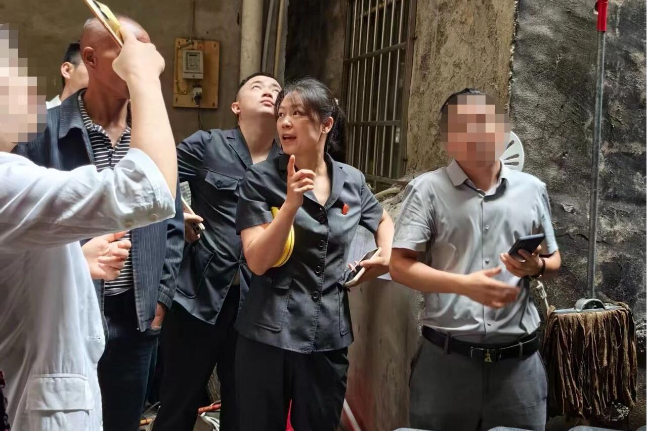 圖為法官實地查看雨棚情況。