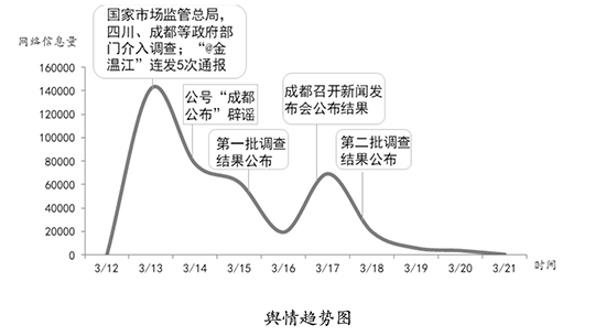3月14日10時(shí)許,微信公眾號(hào)“成都發(fā)布”刊發(fā)文章《這些謠言信不得!》,盤點(diǎn)了警民沖突、家長(zhǎng)跳樓、家長(zhǎng)臥底等流傳甚廣的六大謠言。隨后,中國(guó)網(wǎng)、鳳凰網(wǎng)、四川在線等多家媒體轉(zhuǎn)載,對(duì)遏制網(wǎng)絡(luò)謠言起到?jīng)Q定性作用。相關(guān)部門回應(yīng)后,公眾討論逐步回歸食品安全本身,輿情呈現(xiàn)降溫跡象。