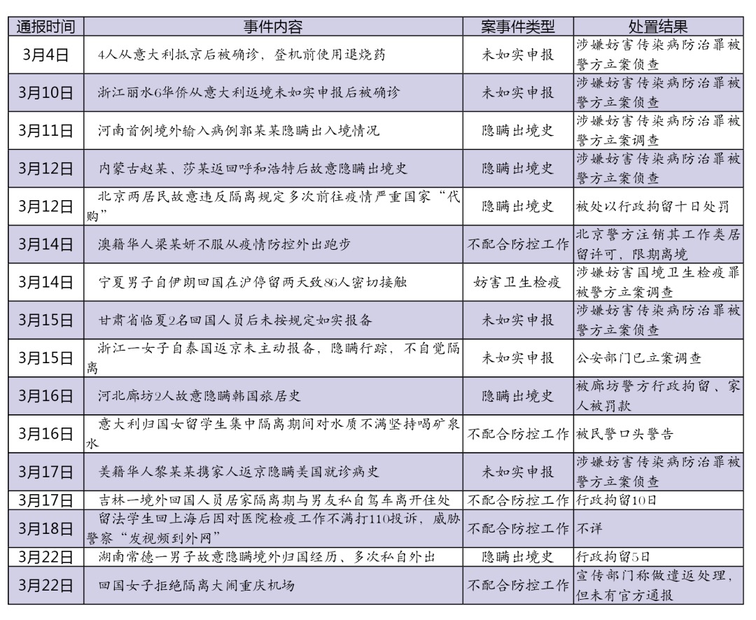 當(dāng)前,國(guó)內(nèi)疫情防控形勢(shì)持續(xù)向好,海外疫情卻在加速蔓延,一些境外人員和海外留學(xué)生選擇回國(guó)避疫,“外防輸入”成現(xiàn)階段疫情防控工作的重中之重。在此關(guān)鍵時(shí)期,少數(shù)人員采取各種手段隱瞞出境史或隱瞞病情,不遵守防疫、隔離等規(guī)定,妨害疫情防控秩序,給我國(guó)的疫情防控工作帶來(lái)巨大壓力,引發(fā)輿論高度關(guān)注。法制網(wǎng)輿情中心(ID:fzwyqzx)選取3月以來(lái)熱度較高的16起個(gè)案,簡(jiǎn)要分析其類(lèi)型和處置結(jié)果,梳理輿論觀點(diǎn),并就后續(xù)處置提出應(yīng)對(duì)建議。