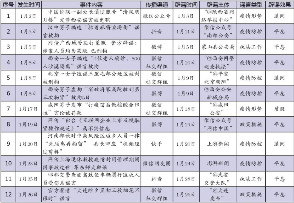 1月網(wǎng)絡涉法謠言辟謠榜單共梳理、匯總12起熱點事件,圍繞謠言持續(xù)時間、傳播渠道、產(chǎn)生地域、類型以及辟謠平臺等維度綜合分析,并篩選兩起關注度較高、具有典型意義的案例研判,以期為網(wǎng)絡辟謠工作提供參考借鑒。