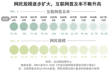 隨著互聯(lián)網(wǎng)的不斷普及,我國網(wǎng)民規(guī)模持續(xù)增長。據(jù)41次-50次(2017年12月-2022年6月)《報(bào)告》顯示,截至2022年6月,我國互聯(lián)網(wǎng)普及率已達(dá)74.4%,較2021年12月提升1.4個百分點(diǎn),網(wǎng)民規(guī)模達(dá)10.51億。