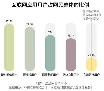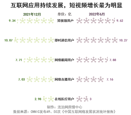 從總體規(guī)模來看,即時通信用戶規(guī)模達(dá)10.27億,占網(wǎng)民整體的97.7%。短視頻用戶緊隨其后,占網(wǎng)民整體的91.5%。網(wǎng)絡(luò)新聞用戶占網(wǎng)民整體的75.0%。網(wǎng)絡(luò)直播用戶占網(wǎng)民整體的68.1%。在線醫(yī)療用戶占網(wǎng)民整體的28.5%,隨著在線醫(yī)療需求的不斷釋放,在線醫(yī)療行業(yè)呈現(xiàn)出高速發(fā)展態(tài)勢,截至2022年6月,在線醫(yī)療用戶規(guī)模較2021年6月增長5991萬。