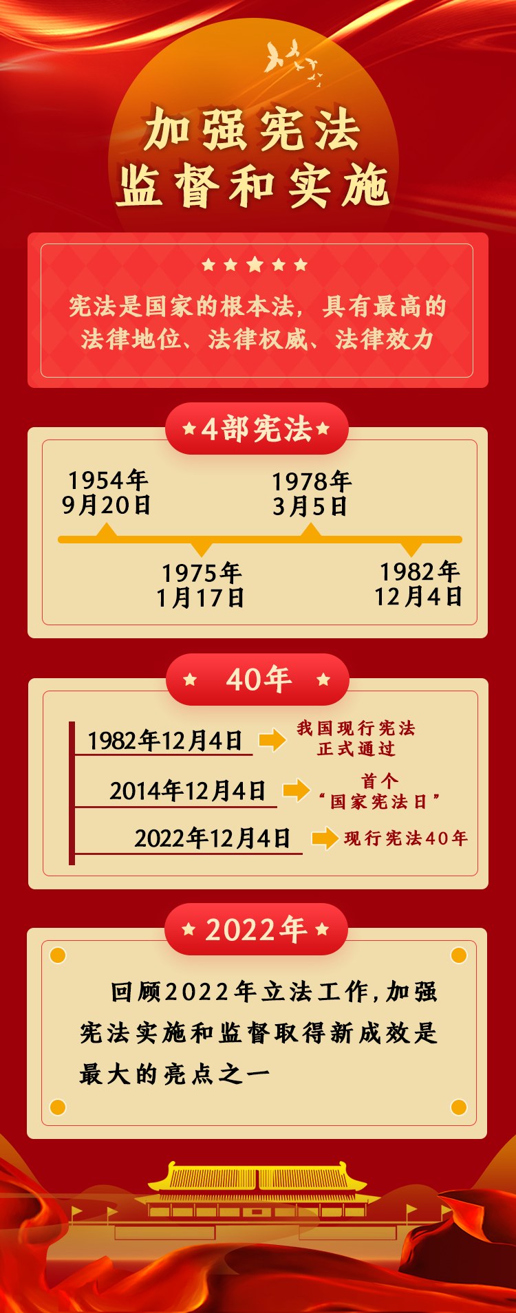 2022年是我國現(xiàn)行憲法公布施行40周年。這40年,也是我國改革開放深入推進、經(jīng)濟社會迅速發(fā)展、人民生活水平不斷提高的40年?;仡?022年立法工作,加強憲法實施和監(jiān)督取得新成效是最大的亮點之一。具體包括,不斷健全保證憲法全面實施的制度體系,通過完備的法律保證憲法實施,嚴(yán)格落實合憲性審查制度機制,深入推進合憲性審查工作,更好發(fā)揮憲法在治國理政中的重要作用,維護憲法權(quán)威和尊嚴(yán)。