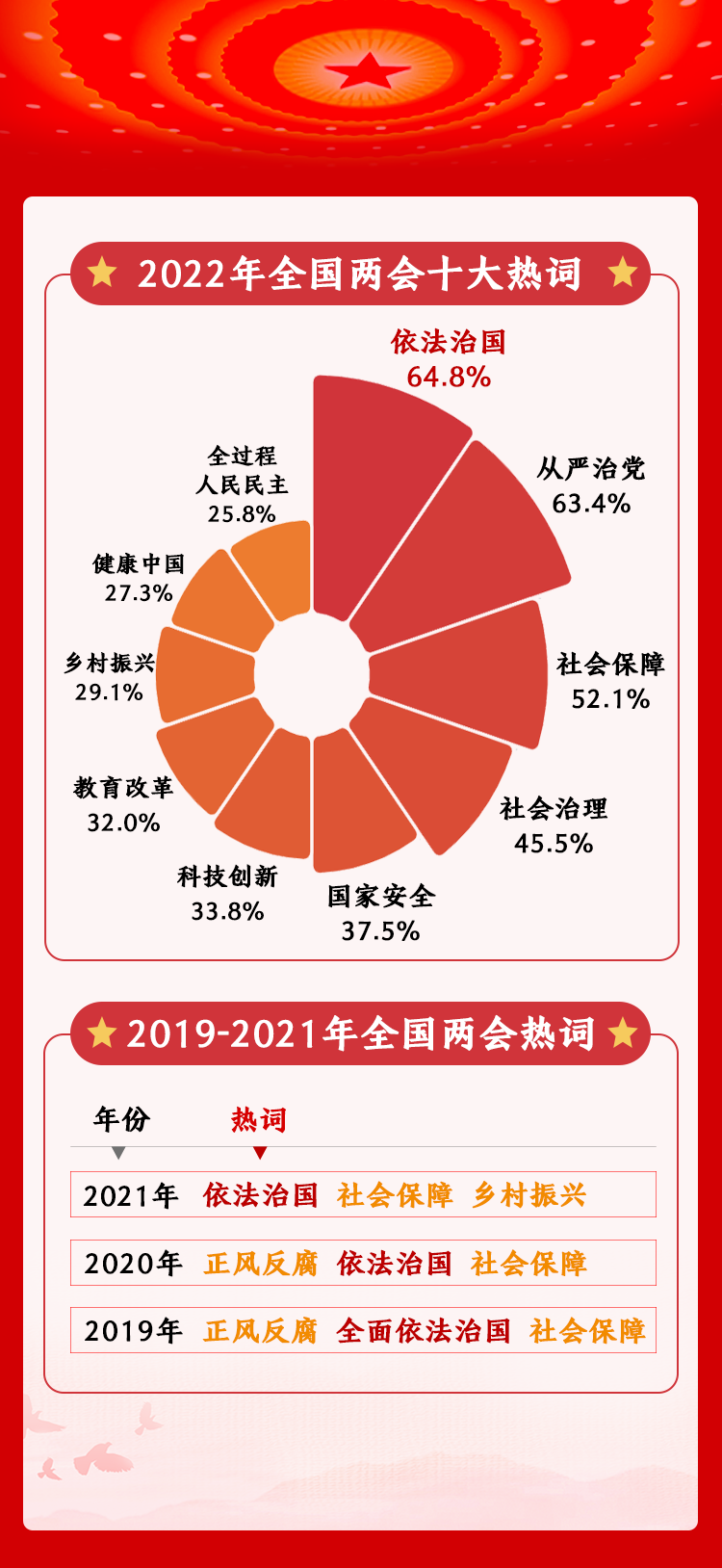 2022年,人民網(wǎng)開展的全國兩會調查評選出十大熱詞。據(jù)調查結果顯示,“依法治國”“從嚴治黨”“社會保障”三大熱詞關注度位居前三位。其中,“依法治國”最受關注,選擇該熱詞的網(wǎng)民占比64.8%。