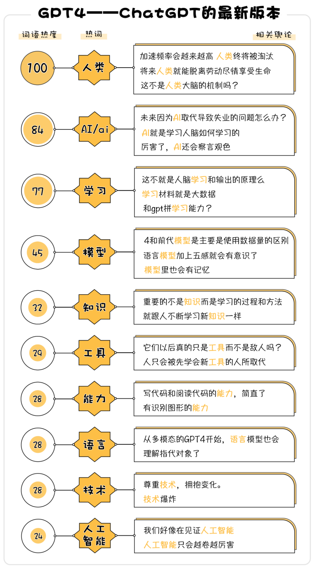 (制作:法治網(wǎng)輿情中心 數(shù)據(jù)來源:在嗶哩嗶哩一則關(guān)于“GPT4會顛覆現(xiàn)有工作流”的視頻中,選取超過10000條彈幕及一級評論,對所選數(shù)據(jù)進行NLP分析,將出現(xiàn)次數(shù)最多的詞語規(guī)定為100,以該詞語為基準對其他熱詞進行等尺度放縮,并選取每個熱詞對應的輿論做可視化分析)