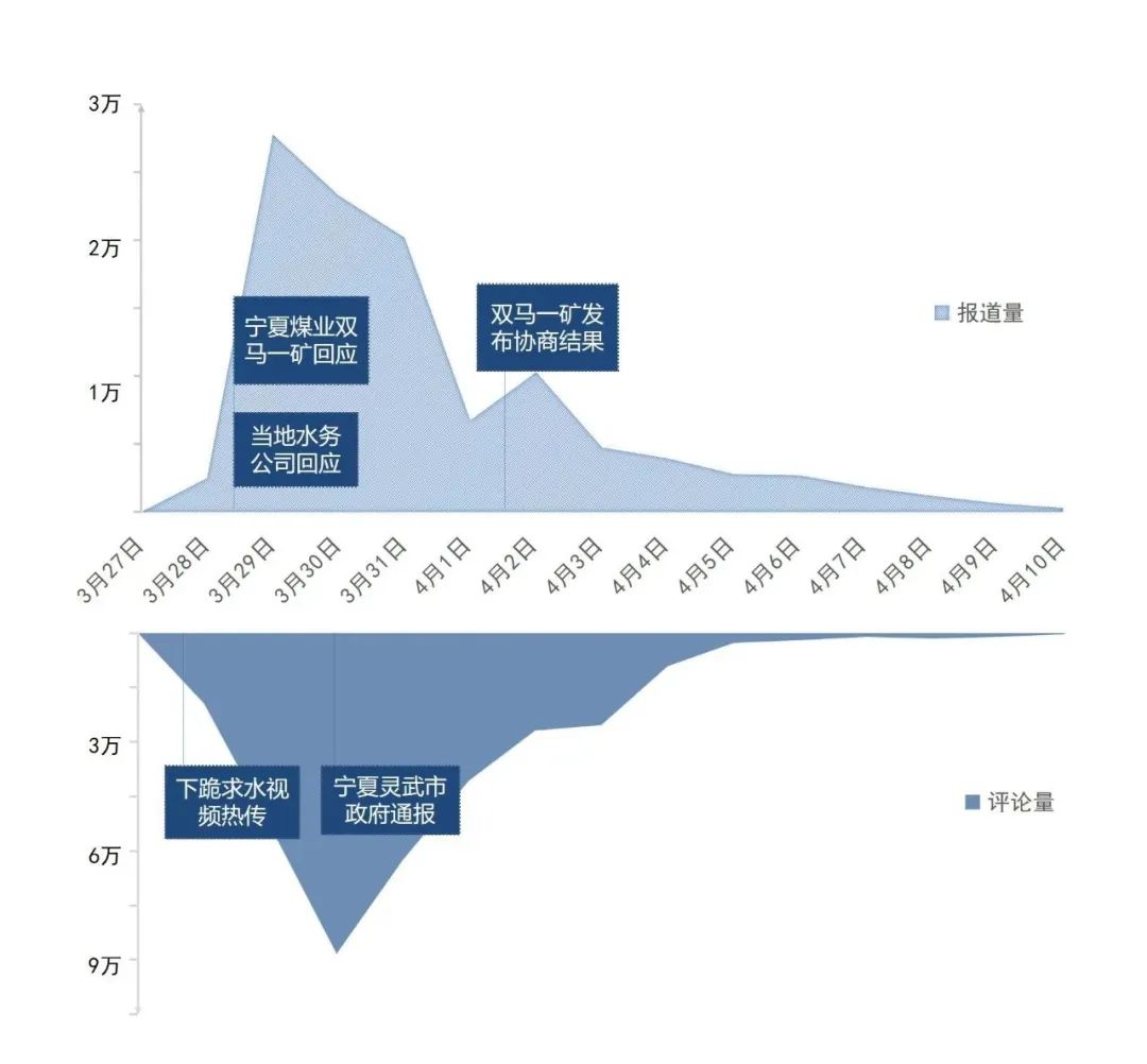 3月29日,部分中央主流媒體發(fā)聲表態(tài):“@中國新聞網(wǎng)”稱“‘缺水’的輿論場需要真相甘霖”;央廣網(wǎng)推出文章《萬畝治沙林被煤礦“斷水”?供水和調(diào)查必須馬上到位》,指出當(dāng)?shù)乇仨毐M快用客觀公正的調(diào)查還原真相,給林場主一個交代,給萬畝林場一個交代,也給公眾一個交代。輿論場還曝光一份判決書,顯示寧夏回族自治區(qū)銀川市中院曾作出判決,明確該煤礦占用林地,要求賠償孫國友727.54萬元。另據(jù)九派新聞報道,當(dāng)?shù)厮畡?wù)公司負(fù)責(zé)人稱,礦場污水處理達(dá)標(biāo),但是水的鹽分過高澆不了樹。煤礦一方稱,污水處理設(shè)備容量比較小,每天只能處理兩千立方,且資金成本太大,不想加大投入。靈武市政府相關(guān)人員向媒體表示,正在針對此事協(xié)調(diào)處理。當(dāng)日,“#萬畝樹木被煤礦斷水面臨枯死#”“#水務(wù)公司回應(yīng)萬畝林場主跪地求供水#”等相關(guān)微博話題沖上熱搜榜前列,輿情熱度達(dá)到峰值。部分網(wǎng)民表示,經(jīng)歷了沙塵暴,才能真正明白造林治沙的好處和難處,“不能讓好人流汗流淚又流血”。微博大V“@胡錫進(jìn)”也呼吁,希望不用下跪崩潰引起巨大輿情也能正常解決。