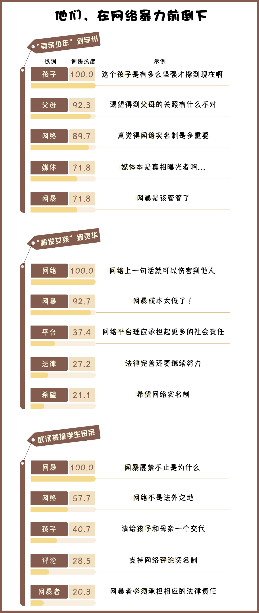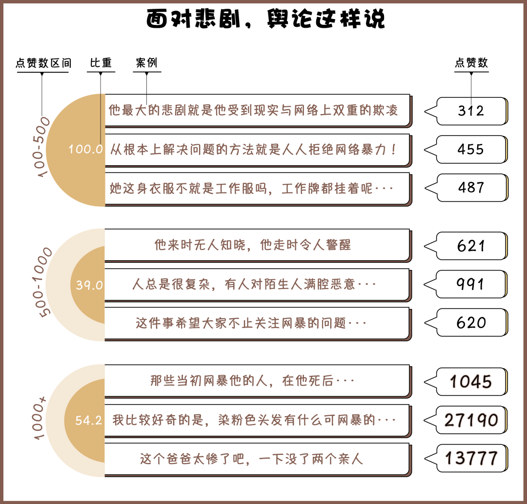 近年來,因網(wǎng)絡(luò)暴力導(dǎo)致的悲劇事件頻出,例如“尋親少年”劉學(xué)州因與親生父母親的矛盾遭受網(wǎng)絡(luò)暴力,最終選擇留下一封“來時(shí)即輕,還時(shí)亦凈”的遺書后自殺;“粉發(fā)女孩”鄭靈華因染粉色頭發(fā)被網(wǎng)暴導(dǎo)致嚴(yán)重抑郁,抗?fàn)師o果后選擇結(jié)束自己的生命;武漢被撞致死小學(xué)生的母親從高樓一躍而下,去世前曾遭遇惡意評(píng)論。