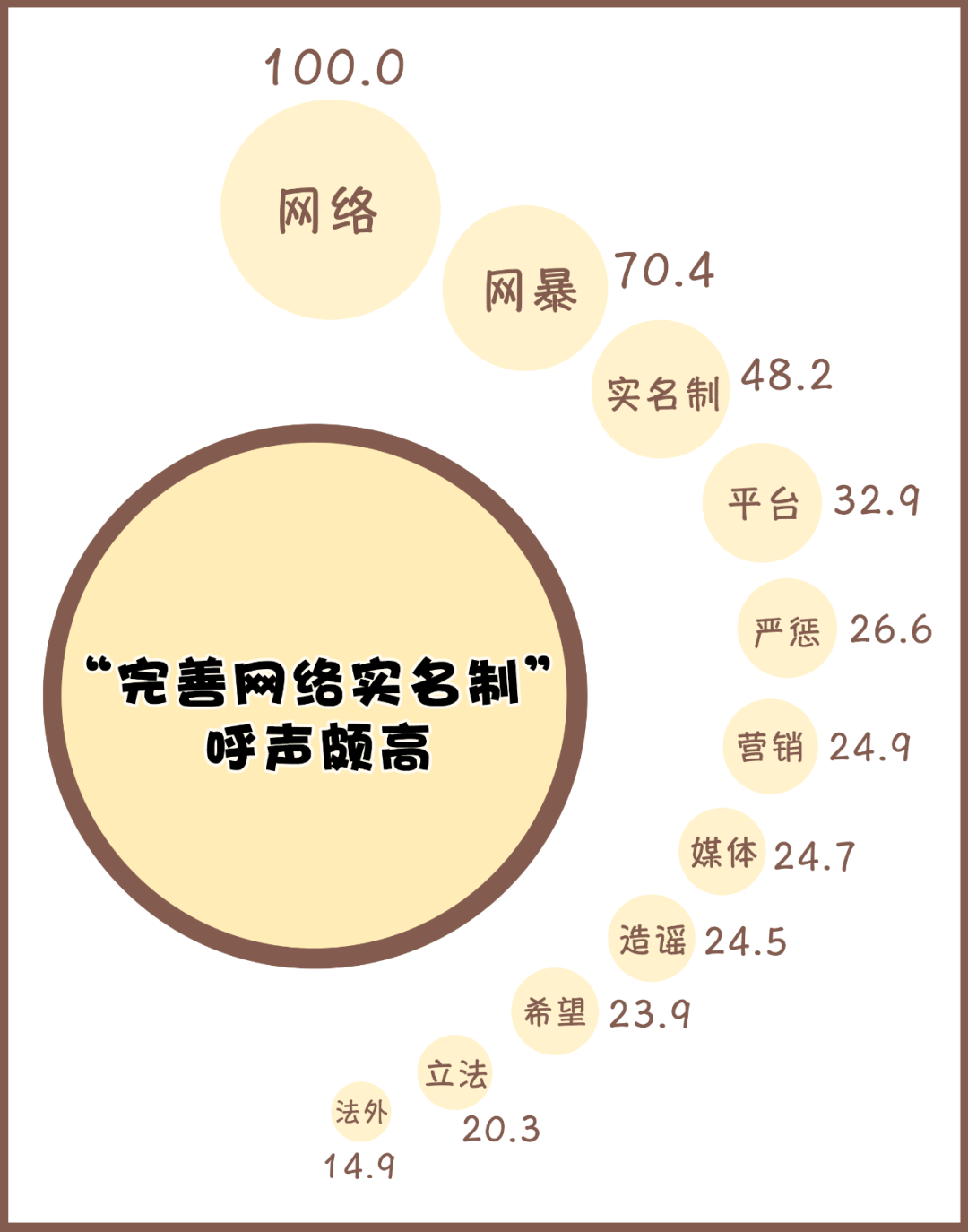 (制作:法治網(wǎng)輿情中心 數(shù)據(jù)來源:以“網(wǎng)絡(luò)暴力”為關(guān)鍵字段,選取并分析205篇微博熱門帖文,將熱度最高詞語規(guī)定為100)