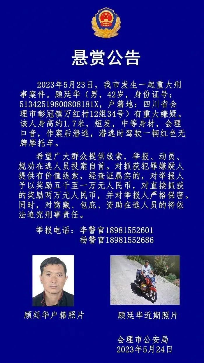 5月24日,四川涼山州會(huì)理市公安局發(fā)布懸賞公告稱,5月23日,會(huì)理市發(fā)生一起重大刑事案件,顧延華有重大嫌疑。公告詳細(xì)描述了嫌疑人的體貌特征、逃逸時(shí)使用的交通工具以及獎(jiǎng)勵(lì)金額等。然而,這則常見的懸賞公告卻在社交媒體上引發(fā)網(wǎng)民熱議,相關(guān)微博話題閱讀量達(dá)到2.5億人次。不少網(wǎng)民追問案件到底有多重大,不滿警方為何不在公告中描述詳細(xì)案情。還有一些網(wǎng)民認(rèn)為嫌疑人如此危險(xiǎn),警方卻鼓勵(lì)群眾抓捕,這種方式不妥。對(duì)此,會(huì)理警方并未予以明確回應(yīng),輿情熱度隨后逐步下降。