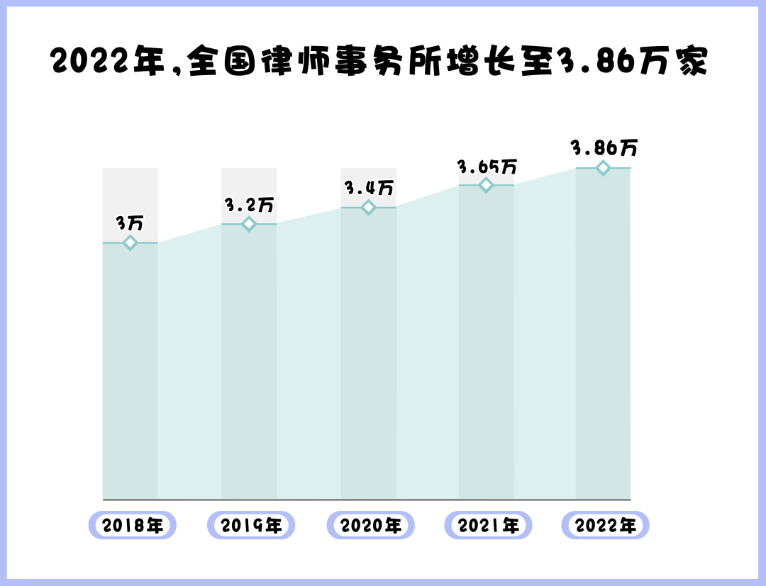 據(jù)司法部發(fā)布的官方數(shù)據(jù)顯示,截至2022年底,全國執(zhí)業(yè)律師已達65.16萬多人,全國律師事務所數(shù)量已經(jīng)增長至3.86萬家,我國律師隊伍不斷壯大。