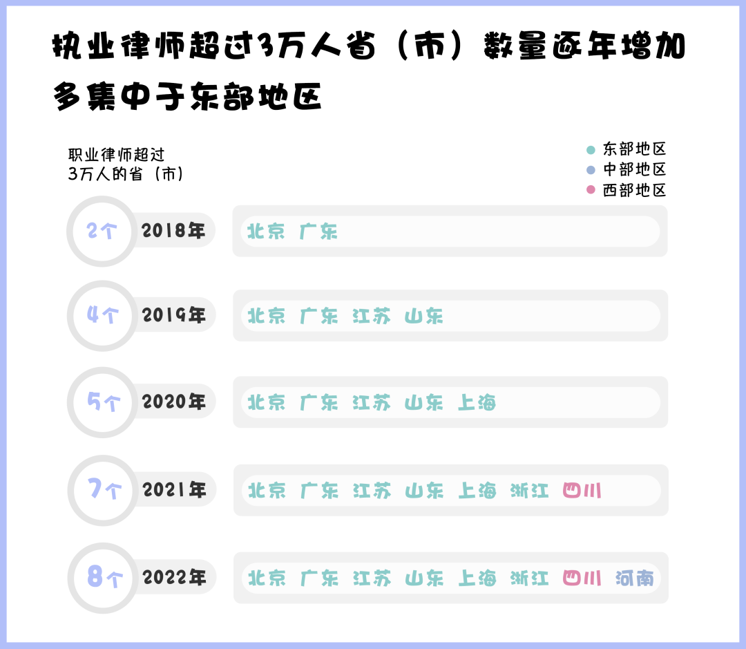 從司法部發(fā)布的數(shù)據(jù)來看,近五年來,律師人數(shù)超過3萬人的?。ㄊ校?shù)量持續(xù)上漲,截至2022年底,共有8個?。ㄊ校┑穆蓭熑藬?shù)超過3萬,其中除河南、四川外,其余?。ㄊ校┚植荚跂|部地區(qū)。