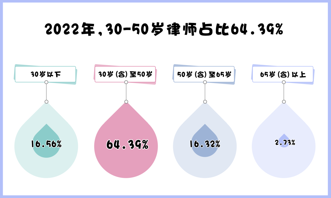 從年齡結(jié)構(gòu)看,截至2022年底,全國律師隊伍涵蓋老中青各年齡段,其中30歲以下的律師10.79萬多人,占比16.56%,30歲(含)至50歲的律師41.95萬多人,占比64.39%,律師隊伍呈現(xiàn)年輕化趨勢。