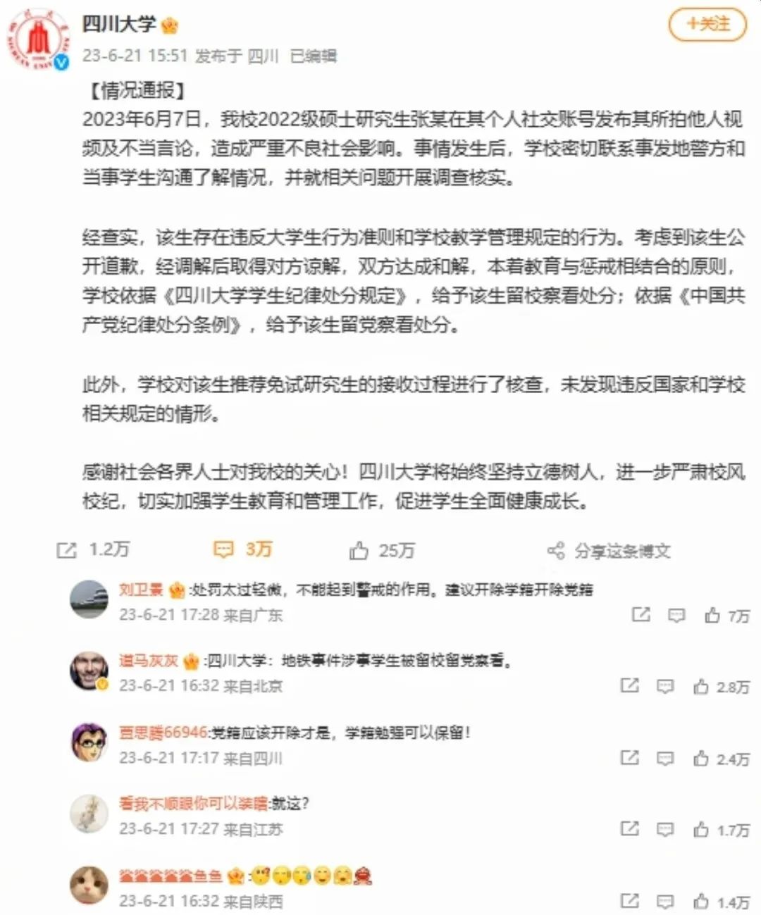 歷經(jīng)較長(zhǎng)的沉淀期后,6月21日,四川大學(xué)官微發(fā)布通報(bào)稱,最終給予張某留校和留黨察看處分。經(jīng)對(duì)張某保研過(guò)程進(jìn)行核查,未發(fā)現(xiàn)其違反國(guó)家和學(xué)校相關(guān)規(guī)定。多數(shù)網(wǎng)民不認(rèn)可此結(jié)果,認(rèn)為四川大學(xué)放任學(xué)生不當(dāng)行為,處置不公。有網(wǎng)民反問(wèn)稱“明顯的造謠,為何僅以道歉結(jié)束”;還有網(wǎng)民認(rèn)為高校的教育機(jī)制和培養(yǎng)標(biāo)準(zhǔn)出現(xiàn)問(wèn)題,質(zhì)疑如此品行的大學(xué)生將來(lái)進(jìn)入媒體,職業(yè)素養(yǎng)堪憂。大V“@老徐時(shí)評(píng)”指出:“造謠也好,拒不道歉也好,這些都屬于個(gè)人品德問(wèn)題,并不是重點(diǎn)。這個(gè)事件的重點(diǎn),是后續(xù)被發(fā)現(xiàn)的保研等問(wèn)題,關(guān)系到教育公平,關(guān)系到普通百姓的上升渠道和上升空間?!?月25日,北京一家律師事務(wù)所發(fā)布通報(bào),認(rèn)為四川大學(xué)的畢業(yè)生品質(zhì)難以信服,故該所不再招聘該校畢業(yè)生。部分網(wǎng)民對(duì)此叫好,部分人則認(rèn)為此舉涉嫌炒作和就業(yè)歧視。“@人民日?qǐng)?bào)”評(píng)論呼吁,莫因個(gè)體案例為群體“貼標(biāo)簽”。