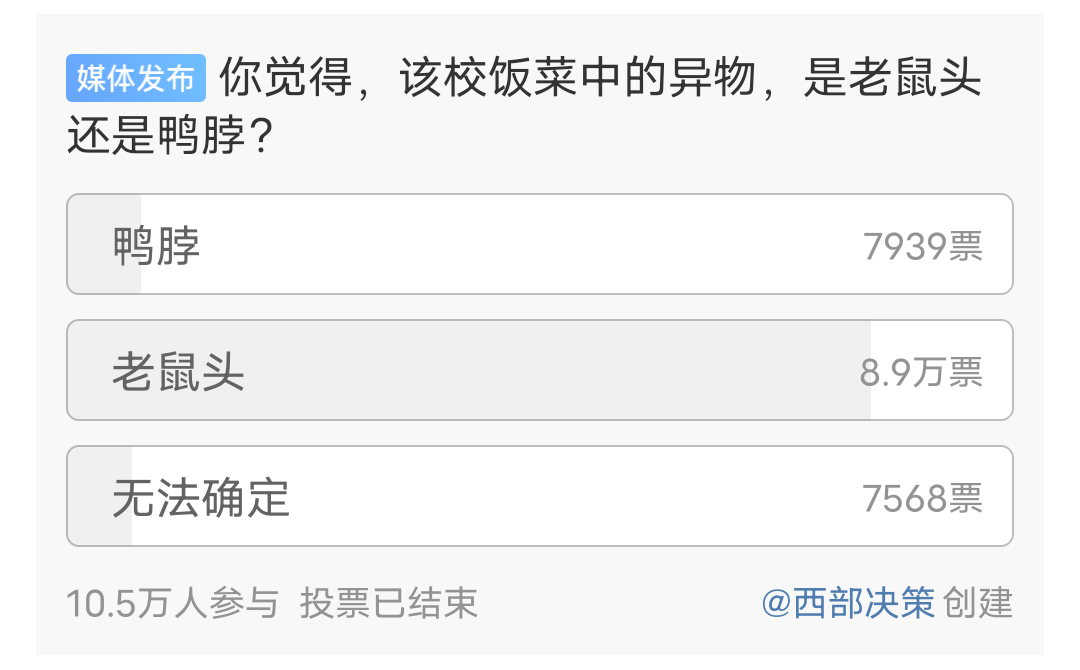大量網(wǎng)民質(zhì)疑當(dāng)?shù)叵嚓P(guān)部門“指鼠為鴨”。據(jù)“@西部決策”發(fā)起的一項(xiàng)超10萬人參與的微博投票顯示,近九成網(wǎng)民認(rèn)為食堂中的異物為“鼠頭”,不少科普博主、微博大V還有媒體均就此事發(fā)表評(píng)論,輿論場(chǎng)基調(diào)以追問和批評(píng)為主。6月6日上午,微博話題“#長(zhǎng)牙的鴨脖令人如鯁在喉#”沖上熱搜榜第一位。另據(jù)《河南商報(bào)》報(bào)道,有網(wǎng)民爆料該校一教職工疑似要求學(xué)生針對(duì)此事進(jìn)行“控評(píng)”。輿論場(chǎng)上,除了批評(píng)校方說謊、隱瞞等聲音之外,還有網(wǎng)民疑惑市場(chǎng)監(jiān)管部門為何替學(xué)?!罢九_(tái)”,猜測(cè)背后存在利益輸送等問題;也有網(wǎng)民拍攝視頻解釋稱,鴨脖在某個(gè)角度看起來很像老鼠頭;更多網(wǎng)民呼吁當(dāng)?shù)乇O(jiān)管部門拿出更多檢測(cè)證據(jù)來。
