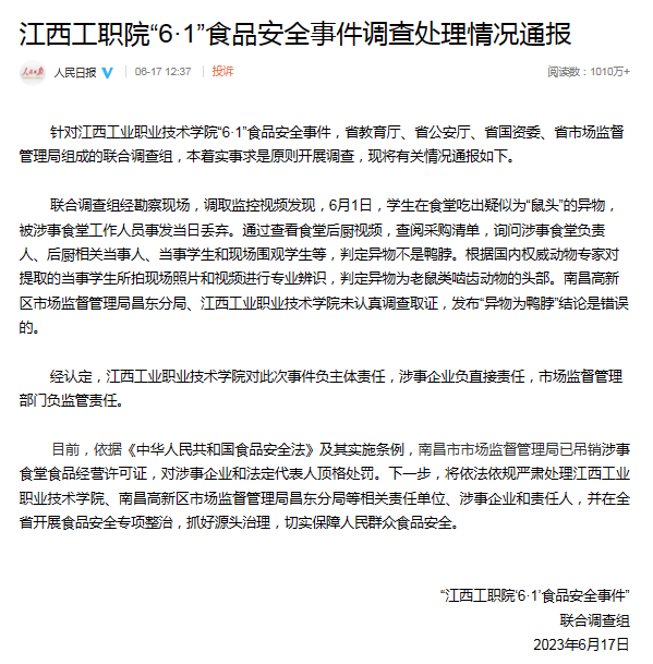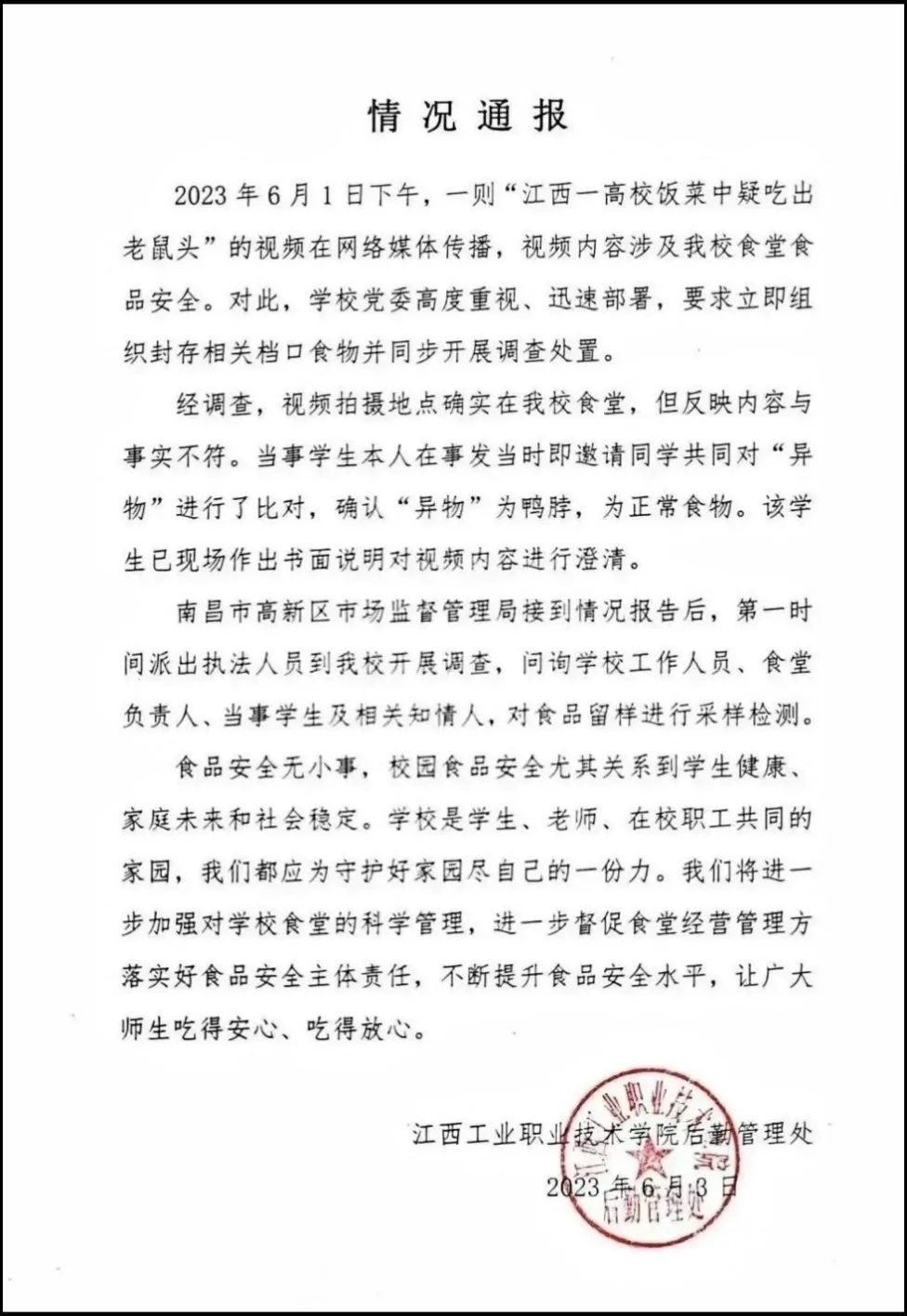 6月2日,據(jù)“@沸點(diǎn)視頻”稱,6月1日,網(wǎng)曝江西工業(yè)職業(yè)技術(shù)學(xué)院學(xué)生吃飯吃出來老鼠頭。據(jù)抖音短視頻顯示,一男子告知食堂工作人員吃出來老鼠頭,工作人員表示“是鴨肉”。報(bào)道稱,涉事的學(xué)校餐飲公司南昌市菁禾餐飲工作人員表示“已經(jīng)看到視頻了,會(huì)去調(diào)查核實(shí)處理”。隨后“@頭條新聞”等賬號(hào)轉(zhuǎn)載該新聞,部分網(wǎng)民留言評(píng)論表示“不信”,并調(diào)侃稱“說是鴨肉的那個(gè)讓他吃掉”。