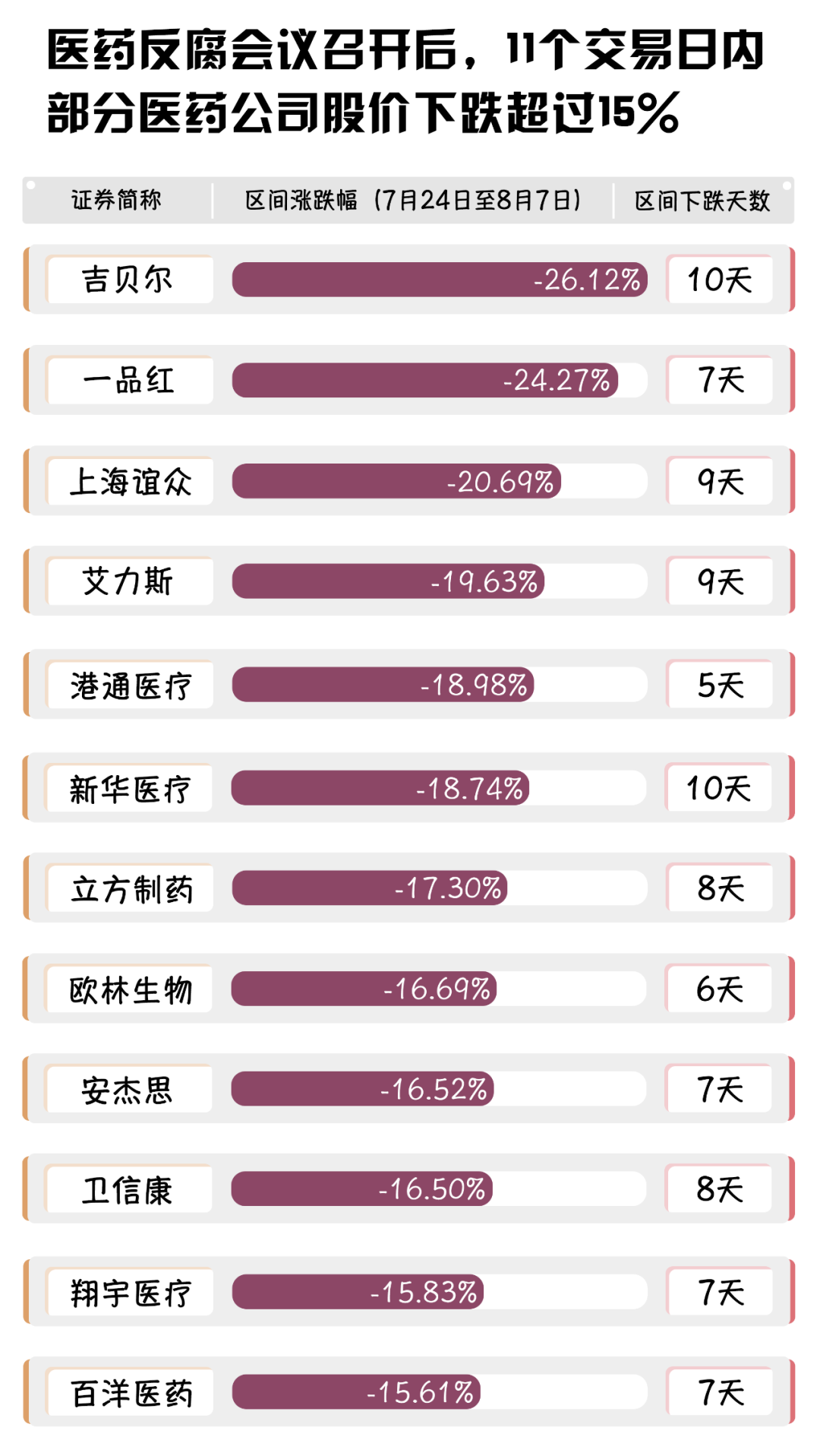 自7月21日,國家衛(wèi)健委聯(lián)合多部門召開醫(yī)藥反腐整治會議后,藥企所受到的沖擊可從股市中窺探一二。根據(jù)wind(萬得)發(fā)布的數(shù)據(jù)來看,從會后的第一個交易日(7月24日)以來,11個交易日內,共有12家醫(yī)藥企業(yè)股價跌幅超過15%,其中11家藥企股價下跌天數(shù)在7天及以上。