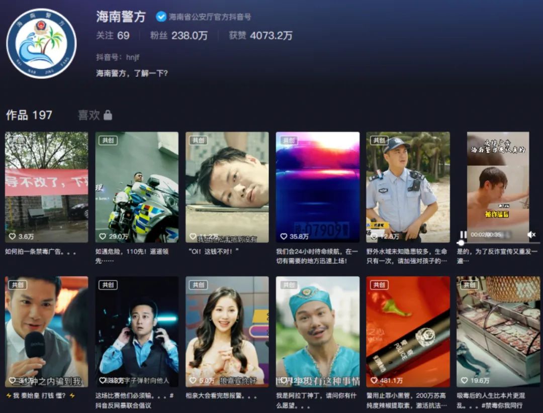 6月6日,海南省公安廳官方賬號(hào)“海南警方”在抖音、快手、微博等多個(gè)平臺(tái)發(fā)布了一則普法視頻,以廣告拍攝的手法介紹“警用酒精測(cè)試儀”性能,告誡司機(jī)切勿酒后駕車(chē)。該視頻一經(jīng)發(fā)布就收獲網(wǎng)民的廣泛好評(píng),在各個(gè)平臺(tái)累計(jì)播放量超過(guò)3300萬(wàn)次,點(diǎn)贊量超過(guò)580萬(wàn)。不少網(wǎng)民表示視頻內(nèi)容幽默風(fēng)趣,積極支持官方大膽“整活”反套路的行為,并在評(píng)論區(qū)與警方互動(dòng)。此后,在7月8日和8月28日,“海南警方”相繼發(fā)布兩條風(fēng)格一致的短視頻,用相同的方式介紹了警用催淚噴射器和警車(chē)等裝備,再度成功“出圈”,各平臺(tái)點(diǎn)贊量累計(jì)接近800萬(wàn),獲得“@人民日?qǐng)?bào)”“@央視新聞”等主流媒體的報(bào)道和轉(zhuǎn)發(fā),微博話題“#海南警方高奢普法廣告又來(lái)了#”“#海南警方普法廣告對(duì)警車(chē)下手了#”等閱讀量累計(jì)超過(guò)3500萬(wàn)人次,登上熱搜榜。該題材還獲得其他政務(wù)賬號(hào)的爭(zhēng)相模仿。除此之外,“海南警方”大膽嘗試各種風(fēng)格,打造出《反詐版拆彈專(zhuān)家》《用港片的方式打開(kāi)交通安全》等多個(gè)創(chuàng)意短視頻,均收獲不錯(cuò)的播放成績(jī),贏得網(wǎng)民認(rèn)可。《工人日?qǐng)?bào)》評(píng)論文章對(duì)此表示充分贊賞和肯定,稱(chēng)希望此類(lèi)“高端”普法和官方“整活”可以更多一些。截至9月14日12時(shí),全網(wǎng)相關(guān)信息量5.6萬(wàn)余條,微博話題“#海南警方高奢普法廣告又來(lái)了#”“#海南警方魔性反詐廣告#”等累計(jì)閱讀量超3億。