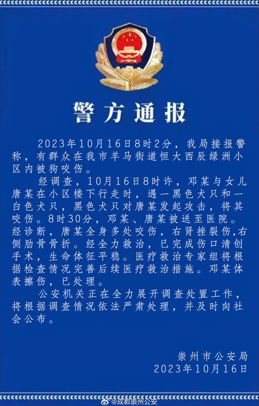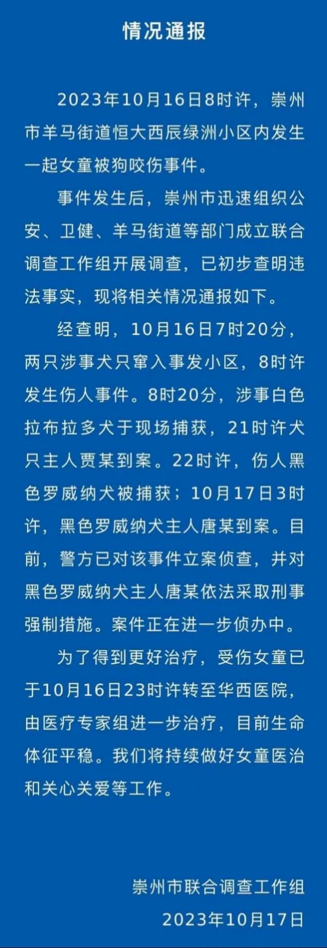 事發(fā)當(dāng)日17時許,崇州公安發(fā)布首份通報,稱被咬女童生命體征平穩(wěn),正全力展開調(diào)查處置工作。輿論場中不少網(wǎng)民探究事發(fā)原因,認(rèn)為養(yǎng)犬規(guī)定落實不到位,導(dǎo)致遛狗不牽繩、飼養(yǎng)烈性犬等亂象出現(xiàn)。10月17日,據(jù)受傷女童母親透露,涉事黑犬已被找到,警方還在排查狗主人。另有媒體報道稱,成都禁養(yǎng)22種烈性犬不包括羅威納,部分網(wǎng)民對警方工作效率表達(dá)不滿情緒。
