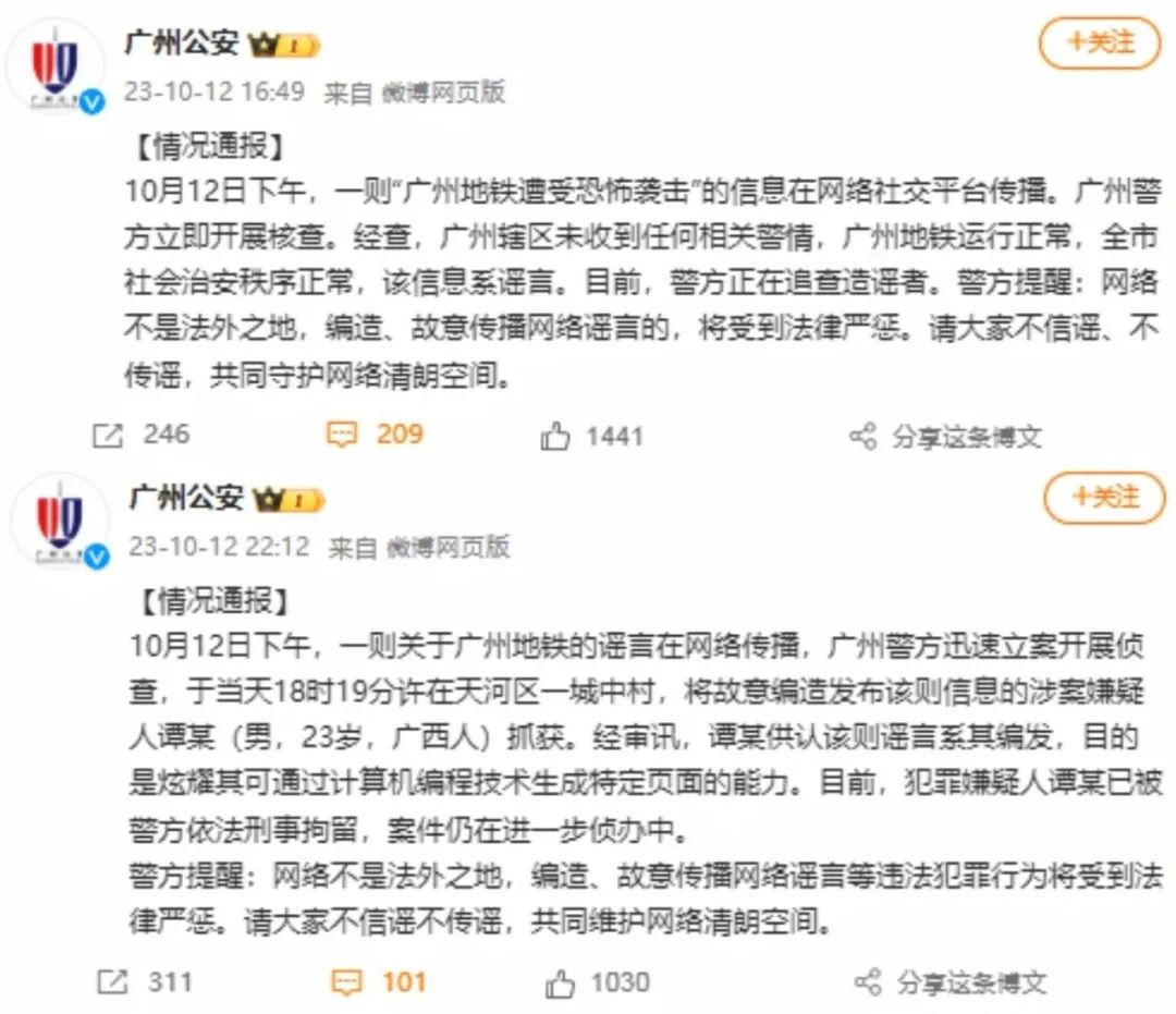 【典型案例】10月12日下午,一則“廣州地鐵遭受恐怖襲擊”的信息在網(wǎng)絡社交平臺傳播。此則消息以截圖的形式被傳播,圖片顯示作者為“廣州市公安局”,內(nèi)容稱“10月12日下午14時,廣州市地鐵3號線珠江新城站,3名恐怖分子攜帶TNT炸藥在地鐵搶劫,走火發(fā)生意外,產(chǎn)生劇烈爆炸,造成多方傷亡”。當日16時49分,官方微博“@廣州公安”發(fā)布通報進行辟謠。同日22時12分,“@廣州公安”再次發(fā)布通報稱,當天18時19分許在天河區(qū)一城中村,警方將故意編造發(fā)布該則信息的涉案嫌疑人譚某抓獲。經(jīng)審訊,譚某供認該則謠言系其編發(fā),目的是炫耀其可通過計算機編程技術(shù)生成特定頁面的能力。