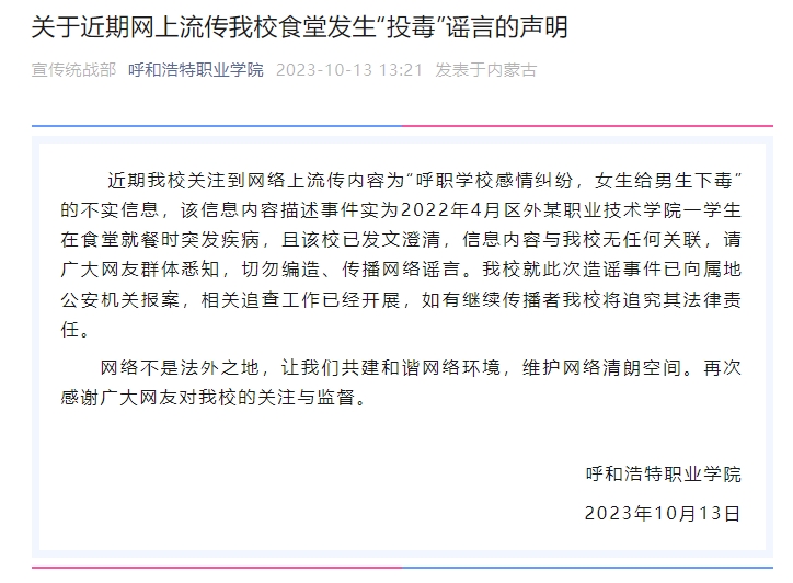 【典型案例】自10月初,連續(xù)有網(wǎng)民在社交媒體發(fā)視頻稱,呼和浩特職業(yè)學院發(fā)生悲劇,一名男生因感情糾紛被女生下毒致死,引發(fā)社會關注。10月13日,該校發(fā)布了一份聲明,澄清這條信息不實,與學校無任何關聯(lián)。據(jù)悉,網(wǎng)絡流傳的視頻中描述的事件實為2022年4月江蘇南京交通職業(yè)技術(shù)學院一學生在食堂就餐時突發(fā)疾病 ,并非因為女生下毒。而且,江蘇南京交通職業(yè)技術(shù)學院在當時就已經(jīng)發(fā)布了相關澄清。再如,10月18日,網(wǎng)傳江蘇南京有男子在酒吧外性侵一名醉酒女子。當日,事發(fā)地所屬南京市警方相關工作人員回應稱,警方已查清此事,沒有性侵,網(wǎng)傳情況有夸大成分。另據(jù)警方透露,某社交網(wǎng)站流傳的不實消息,“是專門的AI軟件寫的”。