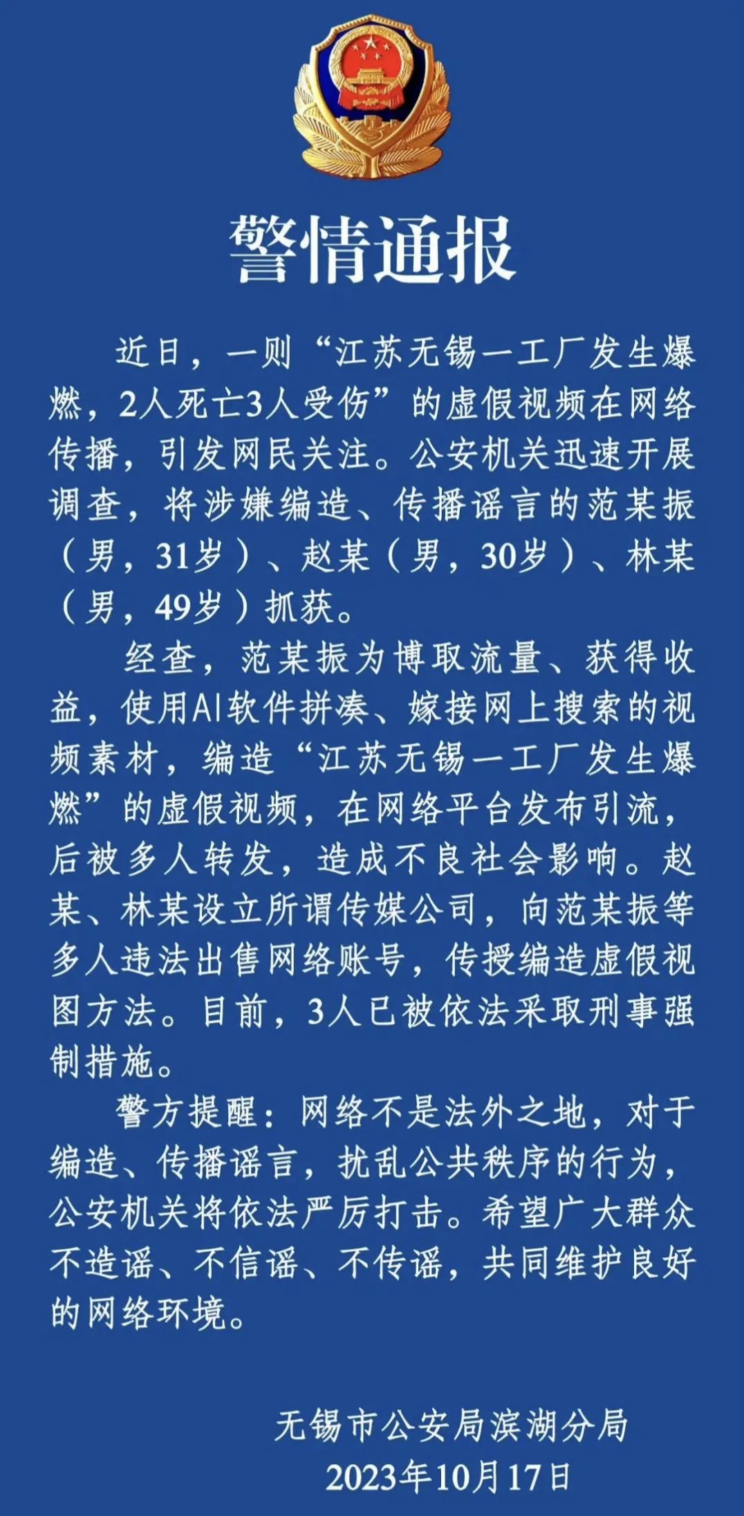 【典型案例】10月17日,一則“江蘇無錫一工廠發(fā)生爆燃,2人死亡3人受傷”的虛假視頻在網(wǎng)絡傳播,引發(fā)網(wǎng)民關注。當日20時許,無錫市公安局濱湖分局微信公眾號“濱湖警事”發(fā)布警情通報,稱此為一起謠言事件,已經(jīng)將造謠、傳謠的范某、趙某、林某三人抓獲。經(jīng)查,范某為博取流量、獲得收益,使用AI軟件拼湊、嫁接網(wǎng)上搜索的視頻素材,編造相關虛假視頻,在網(wǎng)絡平臺發(fā)布引流,后被多人轉(zhuǎn)發(fā),造成不良社會影響。趙某、林某設立所謂傳媒公司,向范某等多人違法出售網(wǎng)絡賬號,傳授編造虛假視圖方法。
