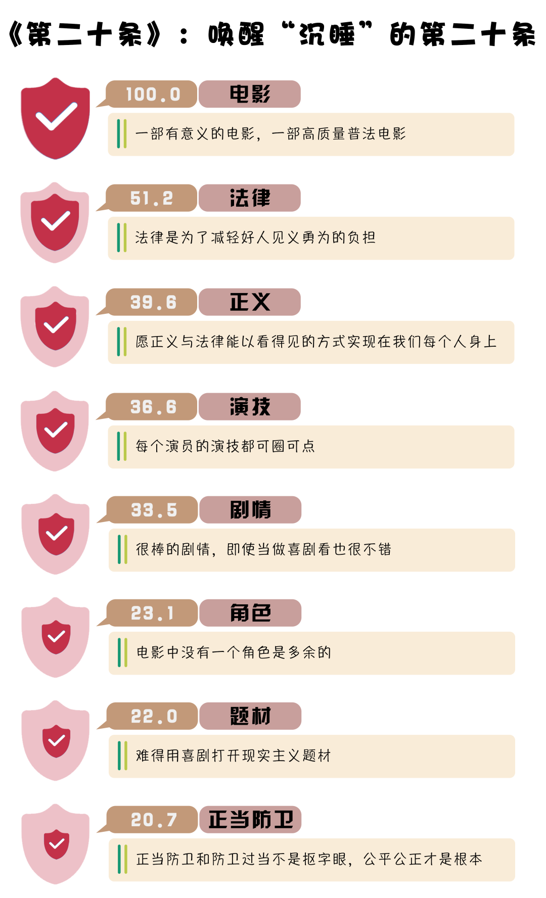 (制作:法治網(wǎng)輿情中心 數(shù)據(jù)來源:豆瓣 注:選取《第二十條》的部分豆瓣短評(píng),對(duì)所選取的短評(píng)做NLP分詞處理,對(duì)詞語做歸一化處理,將頻度最高的詞語規(guī)定為100)
