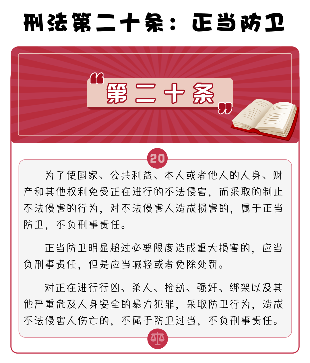 《第二十條》指的是《中華人民共和國(guó)刑法》第二十條,即正當(dāng)防衛(wèi)條款。影片由三起案件構(gòu)成,其中諸多細(xì)節(jié)參考了昆山反殺案、福州趙宇案和淶源反殺案等真實(shí)案例。該電影從普通人的視角聚焦刑法第二十條,展現(xiàn)了關(guān)于“正當(dāng)防衛(wèi)”法條背后的法與情。
