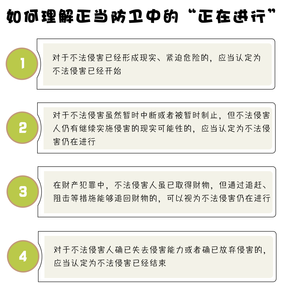 《檢察日?qǐng)?bào)》在《〈第二十條〉法條解析:正當(dāng)防衛(wèi)如何適用,法學(xué)專家、檢察官現(xiàn)身解答》一文中,針對(duì)法條中所要求的“正在進(jìn)行”采訪了清華大學(xué)法學(xué)院教授張建偉,張建偉表示:“所謂‘正在進(jìn)行’就是侵害行為已經(jīng)著手實(shí)施、尚未結(jié)束,侵害行為處于時(shí)間起點(diǎn)到終點(diǎn)的過程?!?/span>