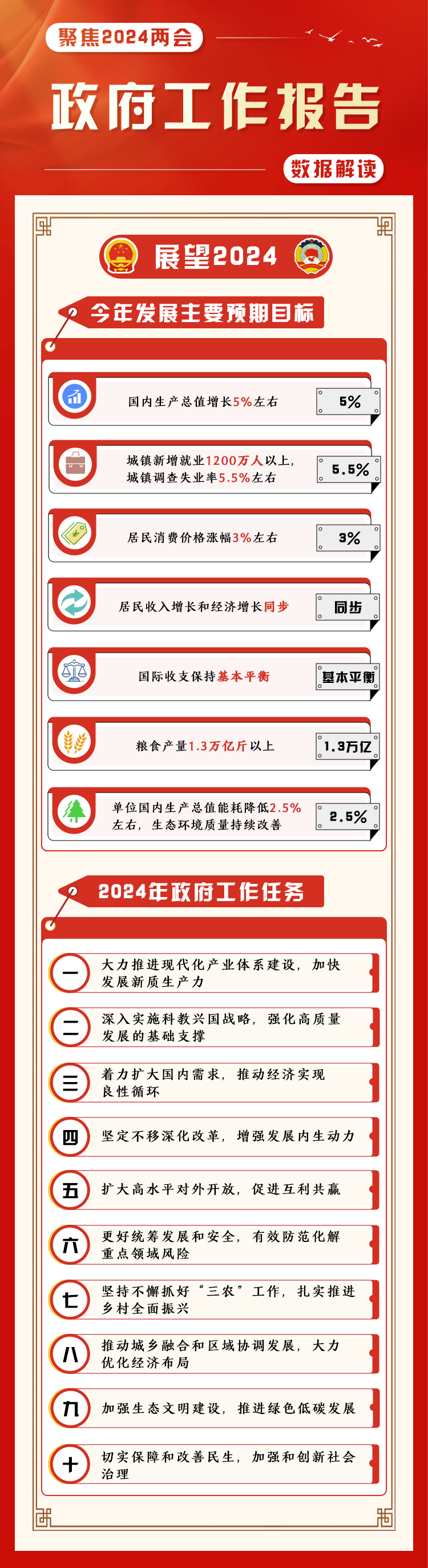 (制作:法治網(wǎng)輿情中心 數(shù)據(jù)來源:新華社微博:《一圖速覽2024年政府工作報(bào)告》;中國新聞網(wǎng):《事關(guān)你我!30句話讀懂政府工作報(bào)告》)