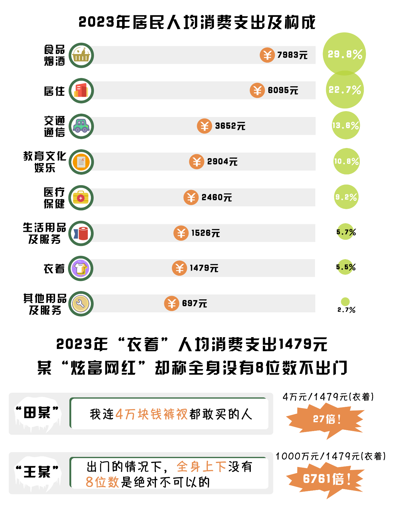 以上網(wǎng)紅炫耀的消費能力遠(yuǎn)超普通居民的人均購買力,成為過著“茶米油鹽醬醋茶”生活的工薪者們不可觸及的“夢”。