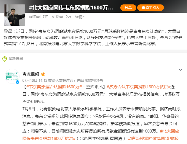 三是捏造救援救助信息。災(zāi)害發(fā)生后,物資調(diào)撥、人員搜救、群眾轉(zhuǎn)移等搶險救援情況被主流媒體持續(xù)報道,吸引輿論廣泛關(guān)注,相關(guān)謠言趁機(jī)流竄,成為傳播主旋律中的雜音。如抖音網(wǎng)民“賓利xx”發(fā)視頻謊稱,河南南陽市臥龍區(qū)陸營鎮(zhèn)王莊村被水淹,臥龍區(qū)使用直升機(jī)進(jìn)行救援。經(jīng)核實(shí),“直升機(jī)救援”一說系虛假信息。網(wǎng)傳“韋東奕(韋神)為洞庭湖水災(zāi)捐款1600萬元”消息引發(fā)關(guān)注,多個相關(guān)視頻獲得數(shù)萬點(diǎn)贊。事后,韋東奕親屬回應(yīng)稱系“假消息”,湖南岳陽市和華容縣慈善部門也表示,未查到有1600萬元的單筆捐款。自媒體這種無底線的“碰瓷式營銷”激起輿論公憤,《新華每日電訊》發(fā)文稱,世上沒有所謂的“正能量謠言”,旗幟鮮明地打擊各類謠言,鏟除造謠傳謠的土壤,才是真正的正能量?!侗本┩韴蟆房脑u論稱,給“韋神”貼金是假,靠造謠撈金是真,任短視頻謠言隔三岔五污染視聽,會對整個社會信任體系造成沖擊。