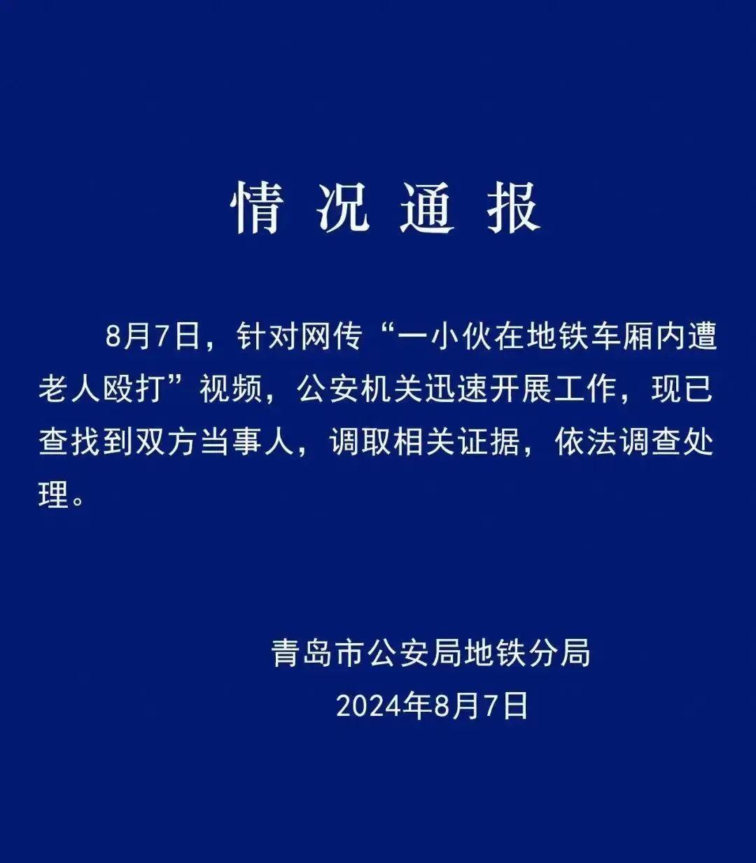 8月9日,微信公眾號(hào)“青島地鐵公安”再發(fā)通報(bào)詳述案情。通報(bào)稱,8月7日,和某城(男,23歲,無業(yè))乘坐地鐵期間對(duì)周圍多名乘客進(jìn)行言語滋擾,在對(duì)翟某緒(男,69歲,退休職工)進(jìn)行滋擾辱罵后,雙方發(fā)生肢體沖突,過程中和某城扯破翟某緒上衣,翟某緒擊打和某城面部。公安機(jī)關(guān)依法對(duì)和某城處以行政拘留處罰,翟某緒毆打和某城致其鼻骨粉碎性骨折,傷情損傷程度為輕傷二級(jí),涉嫌故意傷害罪,依法對(duì)其采取刑事強(qiáng)制措施,案件正在進(jìn)一步辦理中。