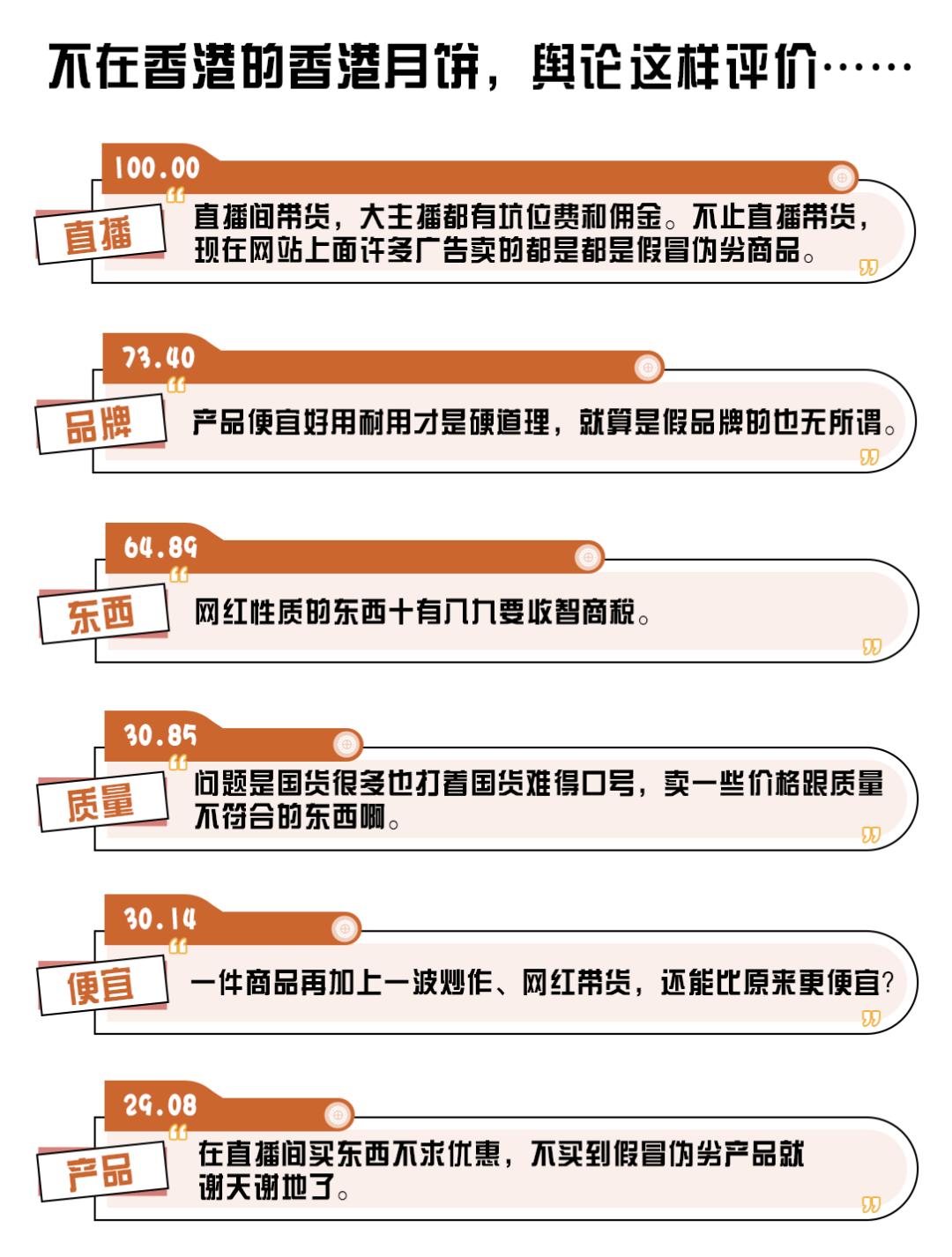 “香港美誠月餅”事件引發(fā)網民圍觀,有網民評論稱,售賣假冒偽劣商品現(xiàn)象不止存在于直播帶貨中,某些網站的廣告也是虛假廣告,二者的共同點是:有錢掙就行,質量無需把關;有網民表示,在直播間買東西不求有多優(yōu)惠,只求商品保真,但這一觀點也遭到了質疑,有網民認為這跟某些主播宣稱為廣大粉絲“把價格打下來”“謀福利”的口號相去甚遠,消費者不應該“退而求其次”;還有網民認為,哪兒生產的不重要,牌子也不重要,貨真價實才最重要。