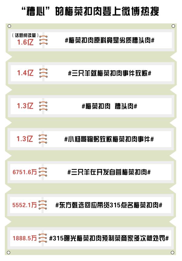 在引發(fā)行業(yè)震蕩后,該事件的影響從預制菜領域蔓延到直播帶貨領域,原因是東方甄選、主播“瘋狂小楊哥”以及其所屬的三只羊網絡科技有限公司均在直播間售賣過該產品。消息一出,輿論嘩然。對此,東方甄選、主播“瘋狂小楊哥”、三只羊網絡均作出回應并致歉。從相關微博話題來看,“#梅菜扣肉原料竟是糟頭肉#”“#三只羊就梅菜扣肉事件致歉#”“#小楊哥鞠躬致歉梅菜扣肉事件#”等話題閱讀量均超過1.3億,輿論聲量頗高。