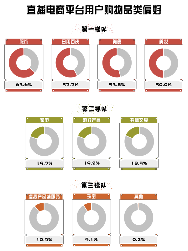根據(jù)微播易、蟬媽媽等聯(lián)合發(fā)布的《2023年中國直播電商機會洞察報告》顯示,直播電商平臺用戶購物品類偏好中,美食位列第一梯隊,占比達到53.8%,反映了公眾對食品消費從吃得飽到吃得好的轉變。