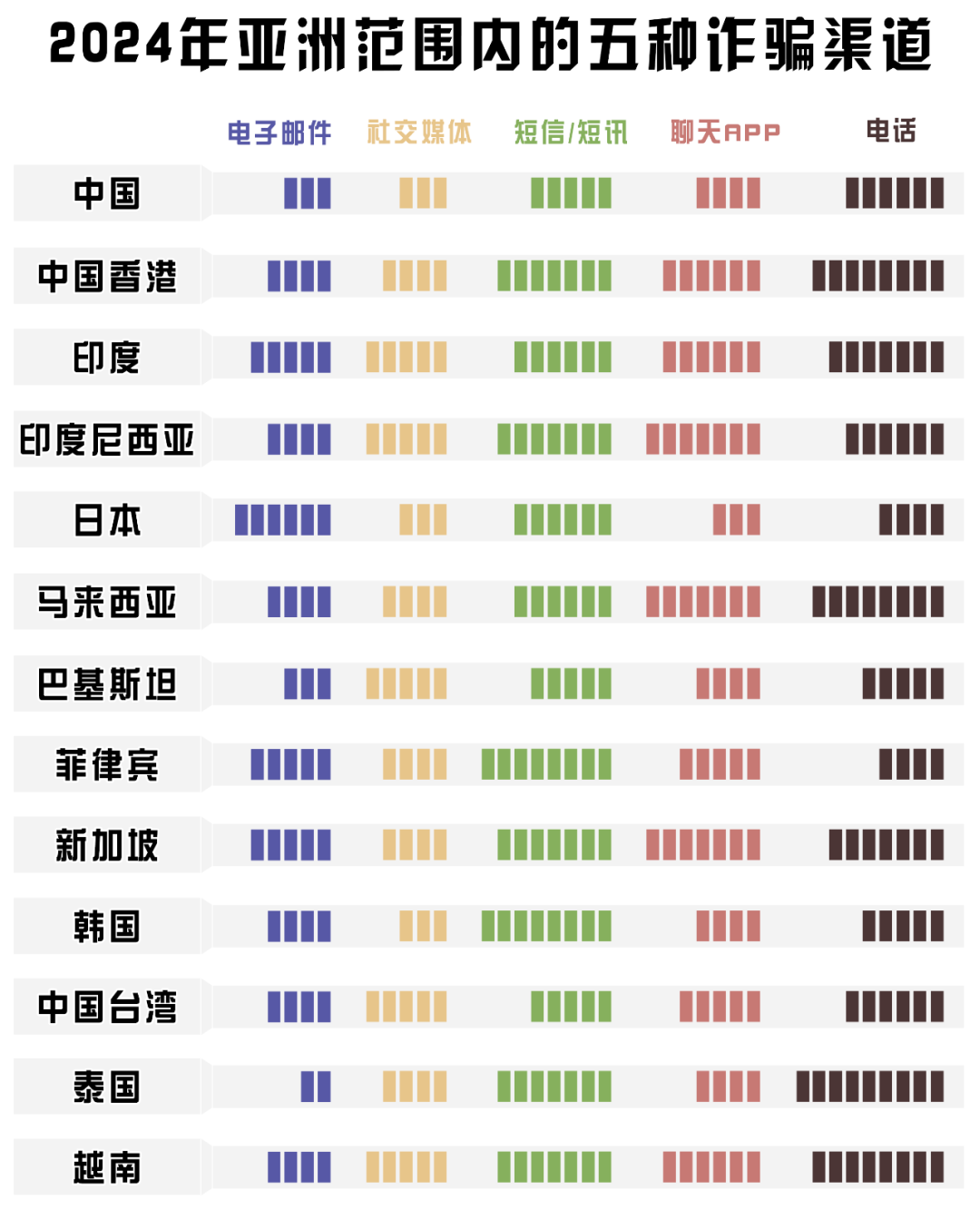 從GASA發(fā)布的《2024年亞洲詐騙報告》來看,在13個國家及地區(qū)中,犯罪分子實施詐騙的渠道通常有如下五種:電子郵件、社交媒體、短信及短訊、聊天APP、電話。