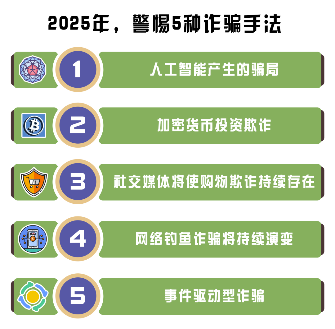 根據(jù)數(shù)據(jù)服務(wù)提供商scamadviser發(fā)布的一篇報告顯示,2025年,大家需要警惕人工智能產(chǎn)生的詐騙、加密貨幣投資詐騙、社交媒體下的購物欺詐、網(wǎng)絡(luò)釣魚詐騙、事件驅(qū)動詐騙等五種詐騙手法。