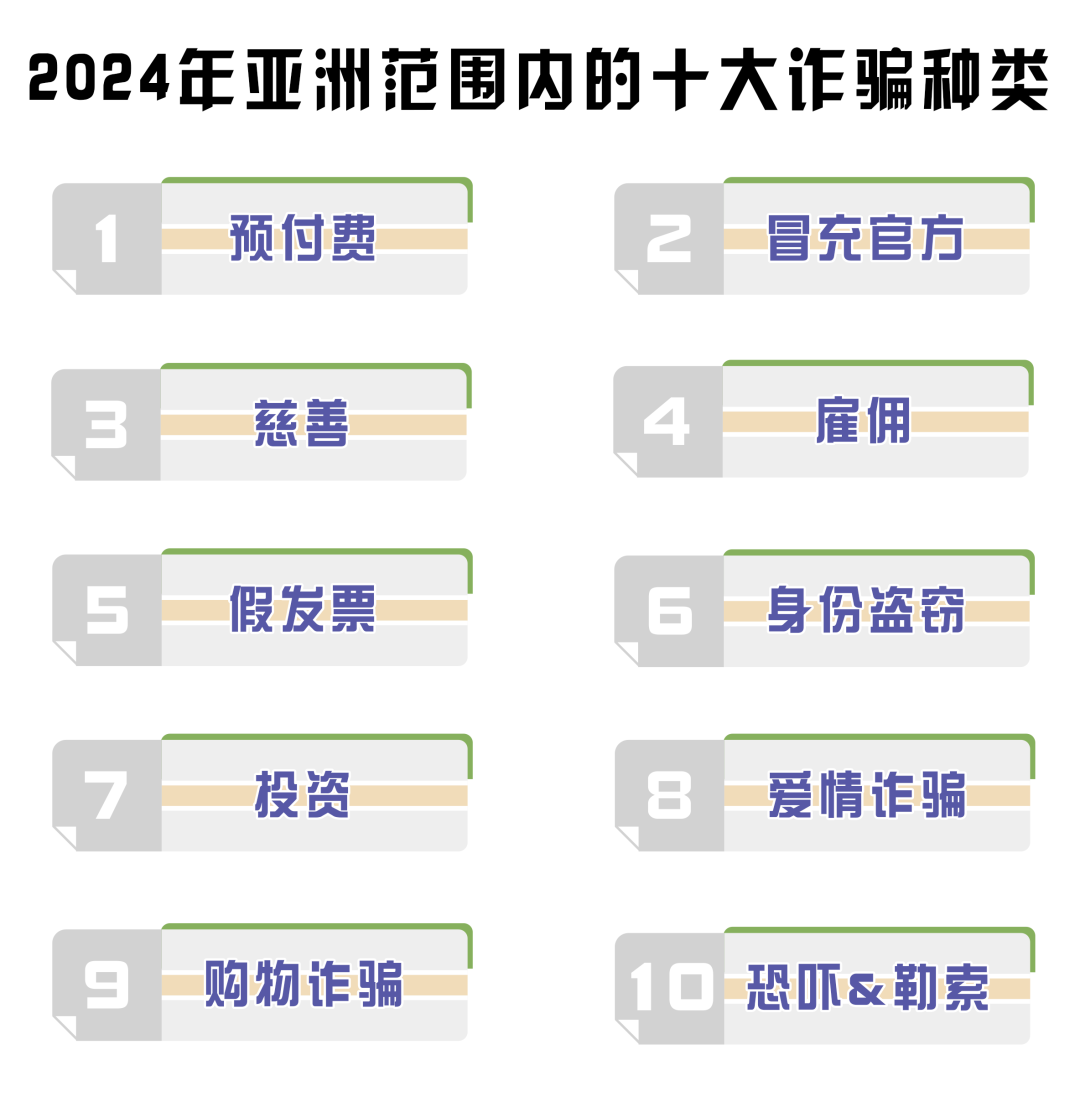 根據(jù)《2024年亞洲詐騙報告》,統(tǒng)計2024年亞洲范圍內(nèi)13個國家及地區(qū)詐騙種類前三名,計算后得出,身份盜竊、投資詐騙、購物詐騙成為出現(xiàn)頻率最高的詐騙類型,占比均為23.08%。此外,冒充官方、政府機關(guān)人員實施詐騙占比達(dá)到10.26%,同樣需要引起重視。