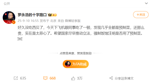 回溯這場討論的源頭,始于羅永浩的一篇微博。9月10日下午,“@羅永浩的十字路口”發(fā)博稱,“好久沒吃西貝了,今天下飛機(jī)跟同事吃了一頓發(fā)現(xiàn)幾乎全都是預(yù)制菜,還那么貴,實在是太惡心了。希望國家盡早推動立法,強(qiáng)制飯館注明是否用了預(yù)制菜?!碧陌l(fā)出后迅速引起網(wǎng)民關(guān)注。