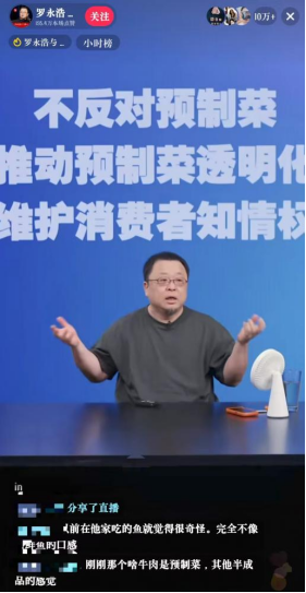 9月12日晚間,羅永浩在多平臺同步直播,開播僅10分鐘其抖音直播間觀看人數(shù)已超10萬。羅永浩在直播中以西貝使用的“凍海鱸魚”舉例,認(rèn)為食用這種經(jīng)過深度工業(yè)化處理的食材與大眾去餐廳追求新鮮的初衷顯然不符,且稱西貝“是所有賣預(yù)制菜餐廳里賣最貴的”。羅永浩強(qiáng)調(diào),預(yù)制菜還沒有正式的國家標(biāo)準(zhǔn),不反對預(yù)制菜,而是主張“推動中國預(yù)制菜行業(yè)透明化、保障消費者的知情權(quán)”,并點贊了餐飲品牌老鄉(xiāng)雞公示菜品區(qū)分“現(xiàn)做”“半預(yù)制”“預(yù)制”加工等級的舉措。