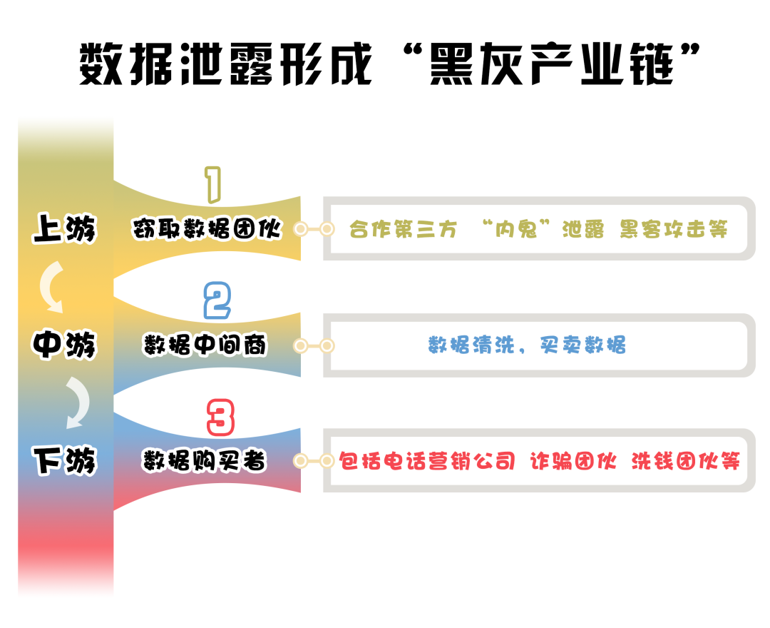 在個人信息“黑灰產市場”中,上、中、下游分工明確、緊密配合,構成完整犯罪鏈條。首先,竊取數據團伙作為上游“供貨商”,通過與第三方及內部人員合作、使用黑客技術等方式拿到原始數據。其次,處于中游的“數據中間商”承接上游“供貨商”提供的原始數據,并對其進行清洗,同時尋找電話營銷公司、詐騙團伙等下游“買家”。最后,下游“買家”會將清洗后的數據轉化為非法獲利的工具,通過定向實施違法犯罪行為達到斂財目的,由此實現犯罪鏈條規(guī)?;I(yè)化的閉環(huán)。
