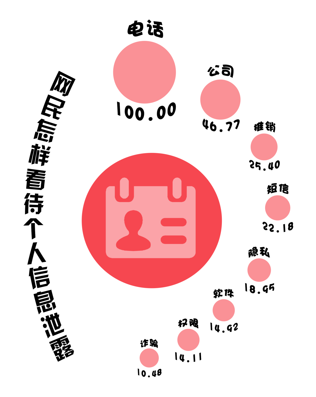 (數據來源:選取嗶哩嗶哩視頻《可怕!這7家科技公司盜取身份證信息,4.68億個人信息泄露》下的931條一級評論,做分詞及歸一化處理,進行分詞后將熱度最高的詞語規(guī)定為100)