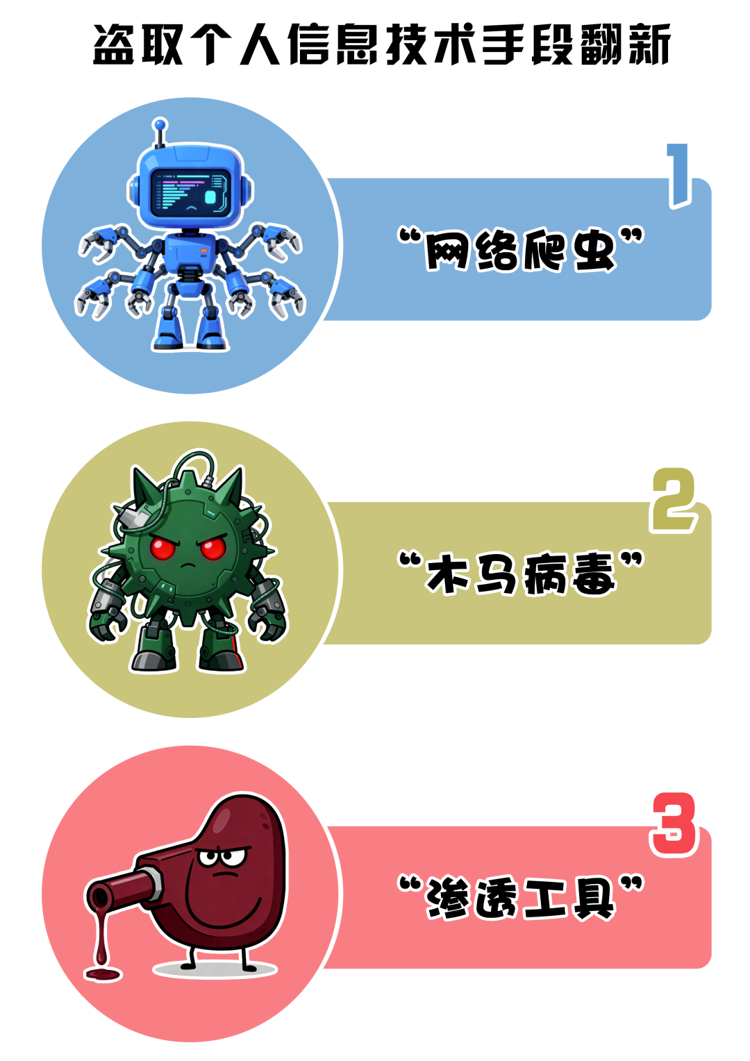 如今,不法分子犯罪手段持續(xù)翻新,不僅推出獲取公民個人信息的“定制化服務”,更是利用網絡爬蟲、木馬病毒、滲透工具等新型技術,大肆竊取數據,給公民日常生活帶來困擾,也埋下了信息安全隱患。