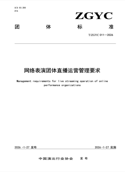 1月27日,中國演出行業(yè)協(xié)會正式發(fā)布《網(wǎng)絡(luò)表演團(tuán)體直播運(yùn)營管理要求》(T/ZGYC 011—2026)團(tuán)體標(biāo)準(zhǔn)(以下簡稱標(biāo)準(zhǔn)),抖音、快手、無憂傳媒等平臺及MCN機(jī)構(gòu)參與起草。
