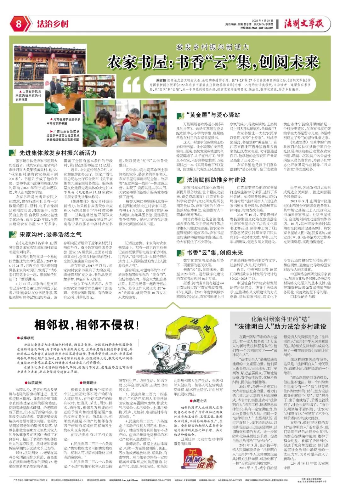 讀書是點(diǎn)燃文明的火炬,是吹響奮進(jìn)的號角。值“4·23”第27個(gè)世界讀書日將臨之際,《法制文萃報(bào)》作為國家新聞出版署《2022年農(nóng)家書屋重點(diǎn)出版物推薦目錄》中唯一入選的法治類報(bào)紙,今與讀者一道聚焦農(nóng)家書屋,從“田間”到“云端”,從一專多能到轉(zhuǎn)型升級,探索農(nóng)家書屋精品化、法治化、數(shù)字化建設(shè),助力鄉(xiāng)村振興。