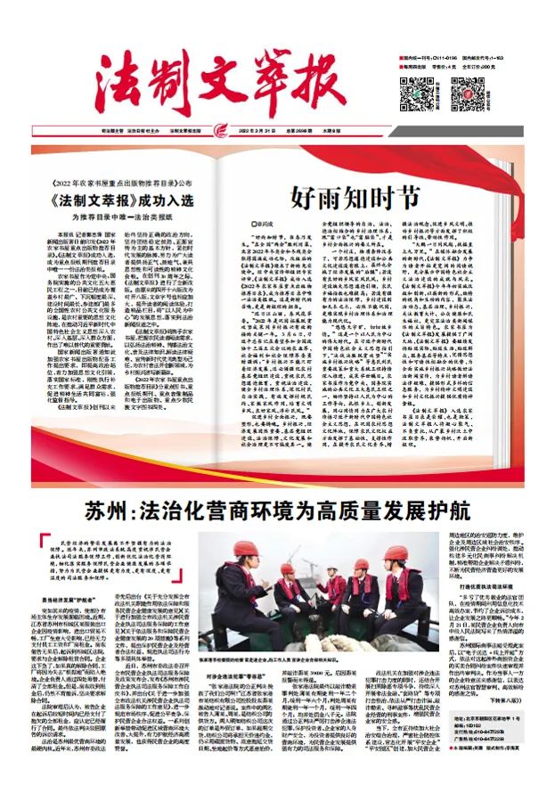 在全國“兩會”勝利閉幕、北京2022年冬奧會和冬殘奧會取得圓滿成功之際,改版后的《法制文萃報》迎來了光榮的使命和擔當。經(jīng)中央宣傳部組織專家評審,《法制文萃報》成功入選《2022年農(nóng)家書屋重點出版物推薦目錄》,成為目錄中唯一法治類報紙。這是新時代的召喚,更是新征程的擔當。