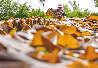 山東省榮成市成山鎮(zhèn)一處海帶曬場,漁民在晾曬海帶。當?shù)丶訌姾Q竽翀鼋ㄔO,大力發(fā)展海帶養(yǎng)殖產業(yè),海洋經濟有效帶動漁民增收致富。李信君攝(影像中國)