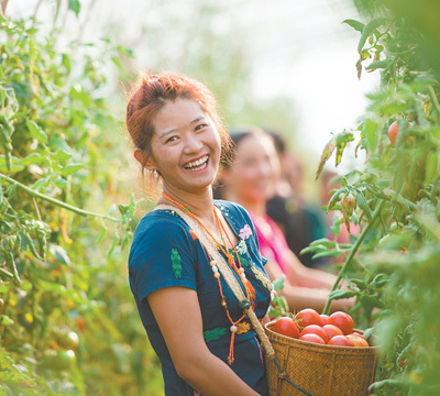 云南省德宏傣族景頗族自治州隴川縣蔬菜種植合作社的西紅柿喜獲豐收,正在采摘的農民喜笑顏開。桂金再攝(人民視覺)